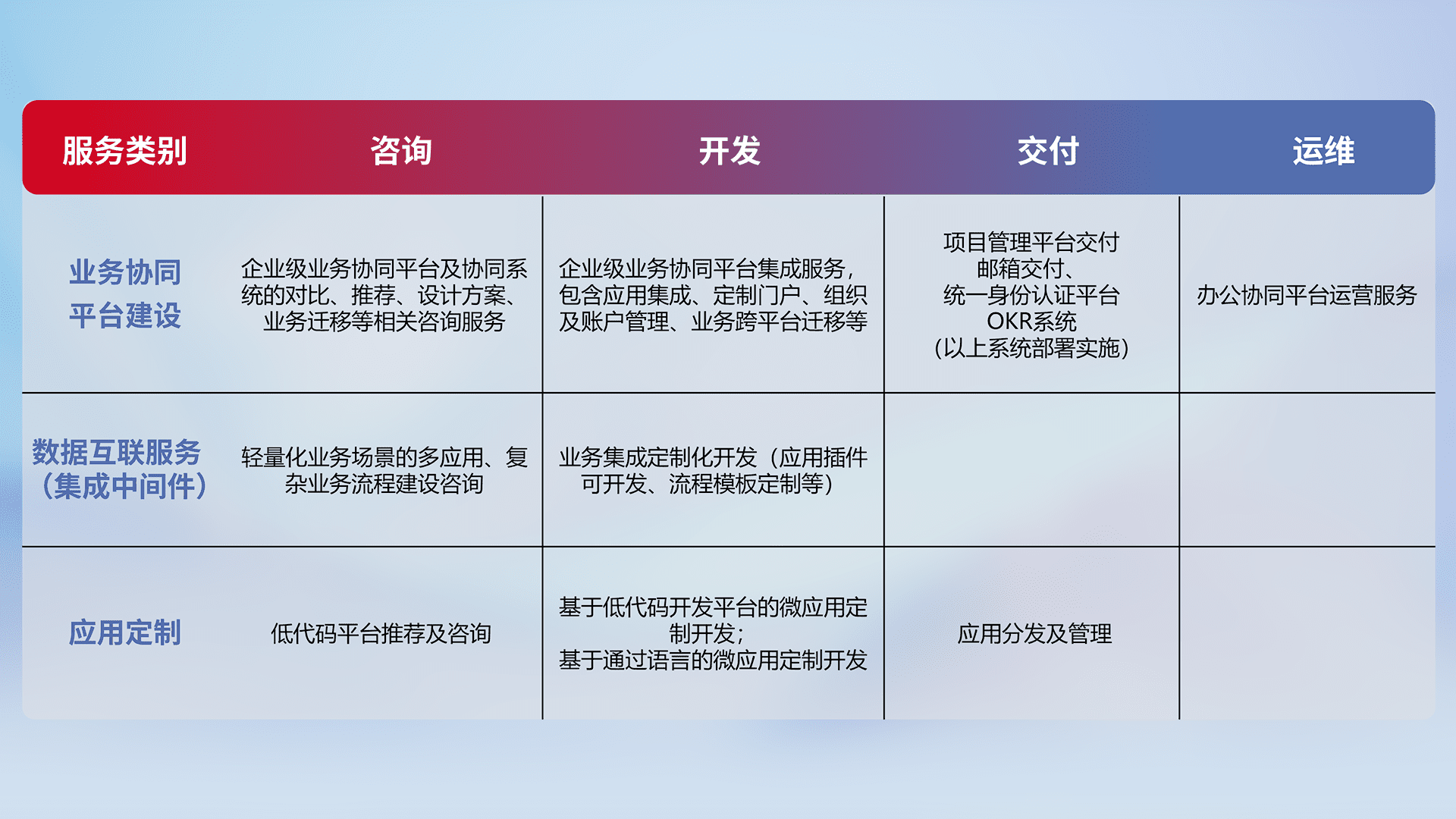 针对钉钉、、企微、、IDaas等平台级产品提供产品的规划、、、、方案、、、交付、、、定制化开发等服务,,,实现如统一协同办公、、、、智能客户服务、、混合会议管理、、、、智能数据查询、、、等业务场景,,,,实现数字化转型。。。